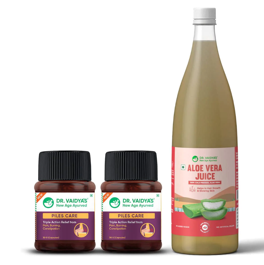 Dr. Vaidya’s Ayurvedic Piles Combo is a carefully curated selection designed by expert doctors to potentially aid in improving digestion and providing relief from piles. The combo consists of 2 Piles Care bottles and 1 Aloevera Juice bottle.