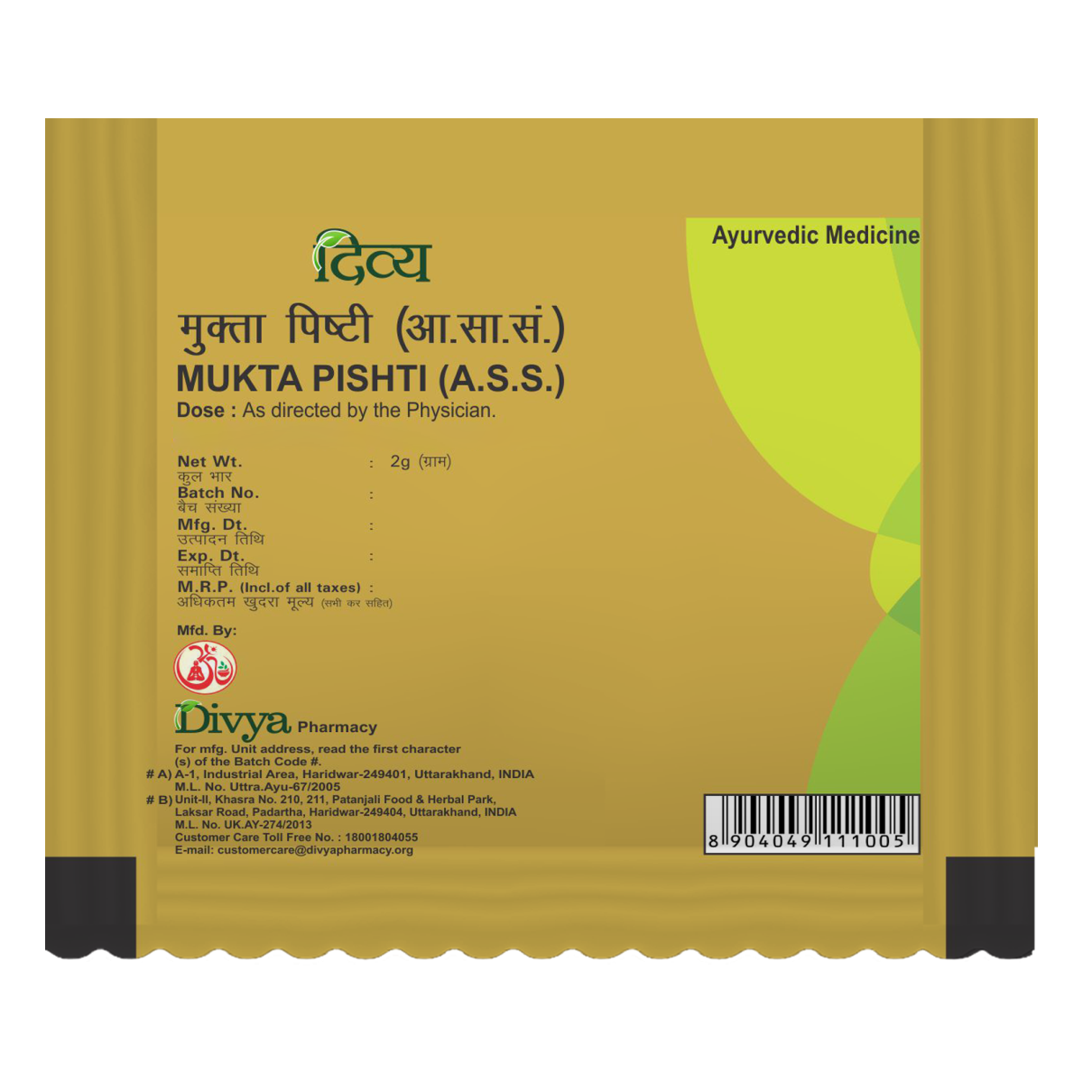 - Patanjali Mukta Pishti is based on Ayurvedic principles. The supplement is manufactured by Divya Pharmacy.