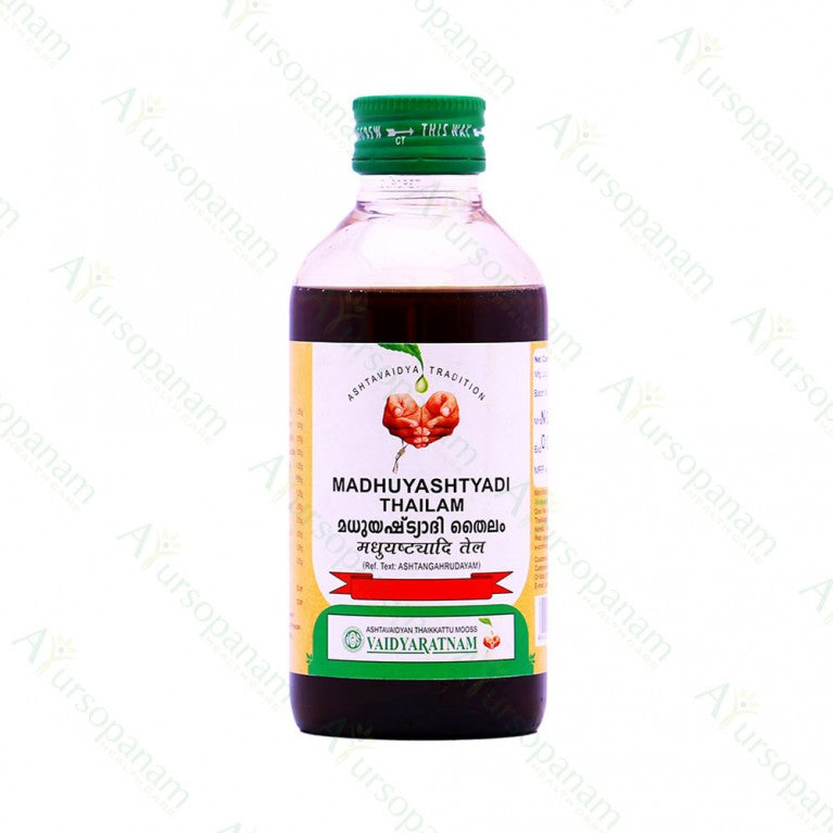 • Vaidyaratnam Madhuyashtyadi Thailam is a traditional Ayurvedic herbal oil formulated with a blend of natural ingredients for topical use.